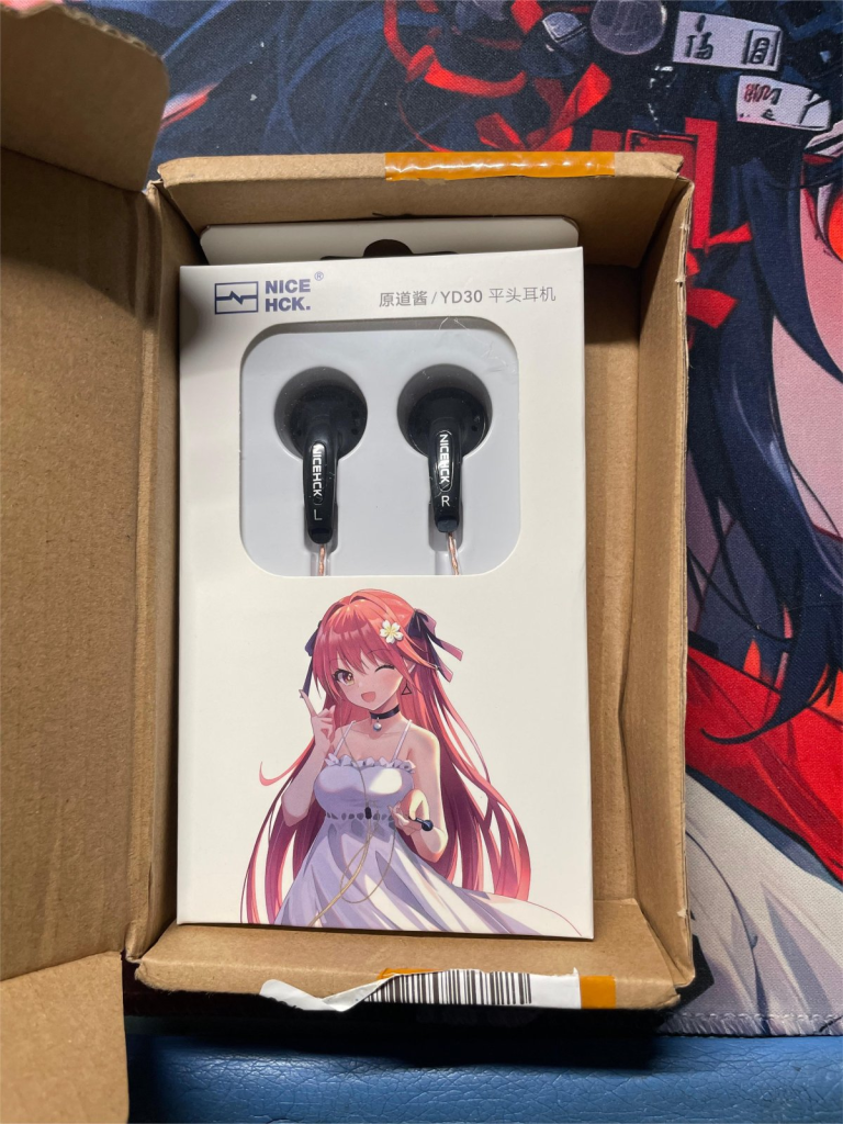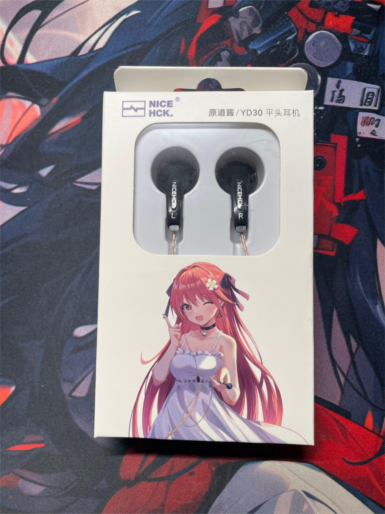 拆开外包装就是耳机本体包装了,看起来和路边文具店里的并无二致。正面就是可爱的原道酱,从上方的透明观察窗可以看见耳机的外观。