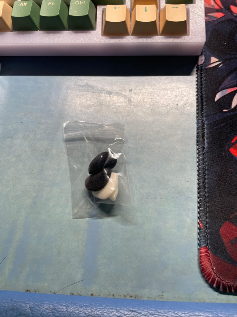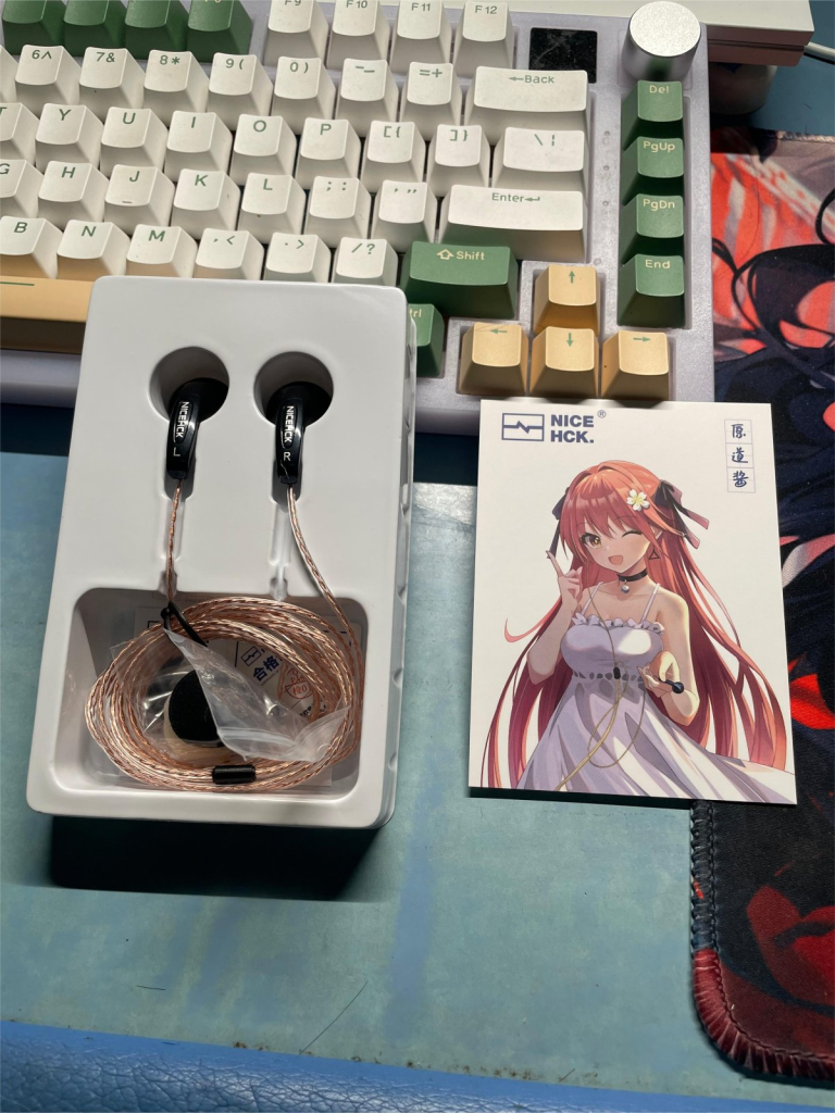 打开包装盒后就可以看到全部的配件了,包括耳机本体与线材,一张原道酱的卡片,以及一黑一白两对耳套。