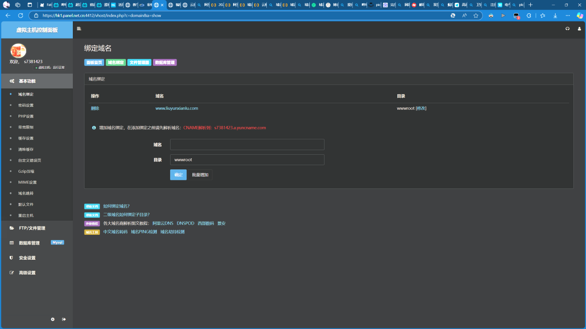 随后回到服务器的控制面板,将网址填写好之后点击确定即可将服务器与域名进行绑定了。