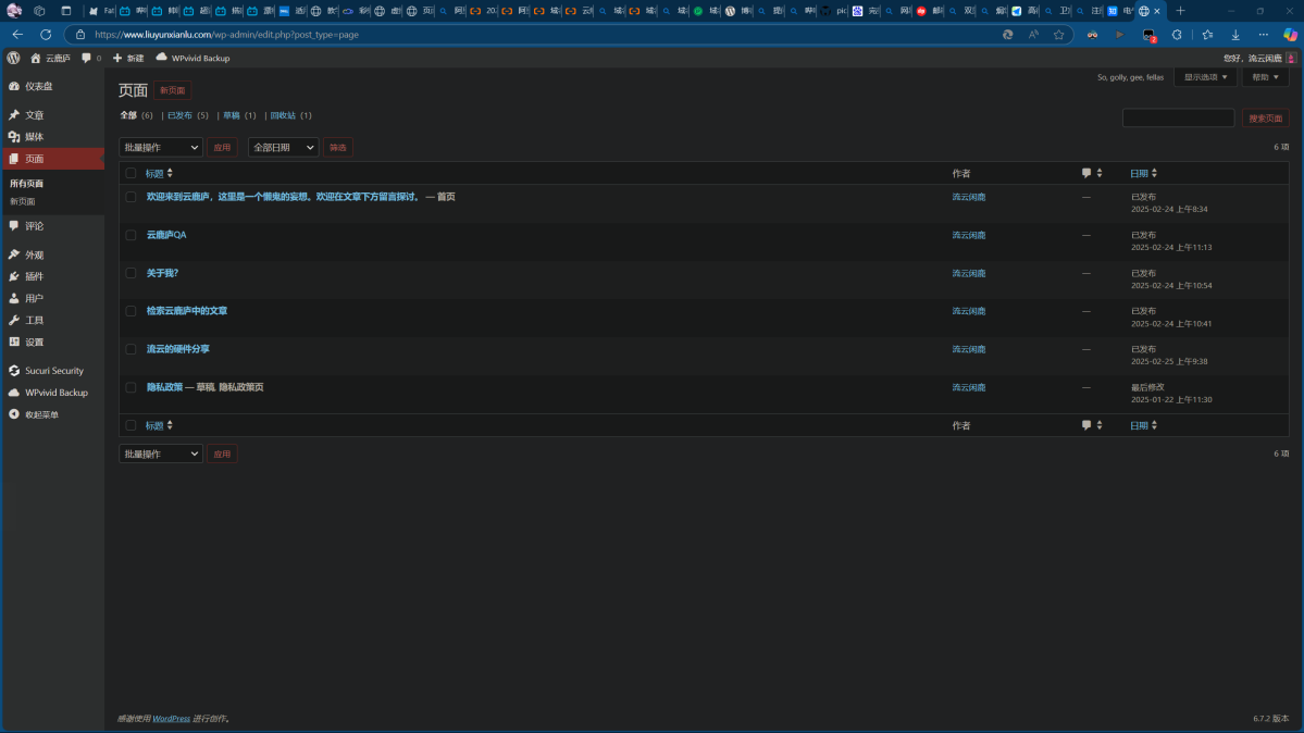 先按照(我感觉的)关键程度简单介绍一下WordPress的后台,首先是“页面”,这是我的“页面”页面: