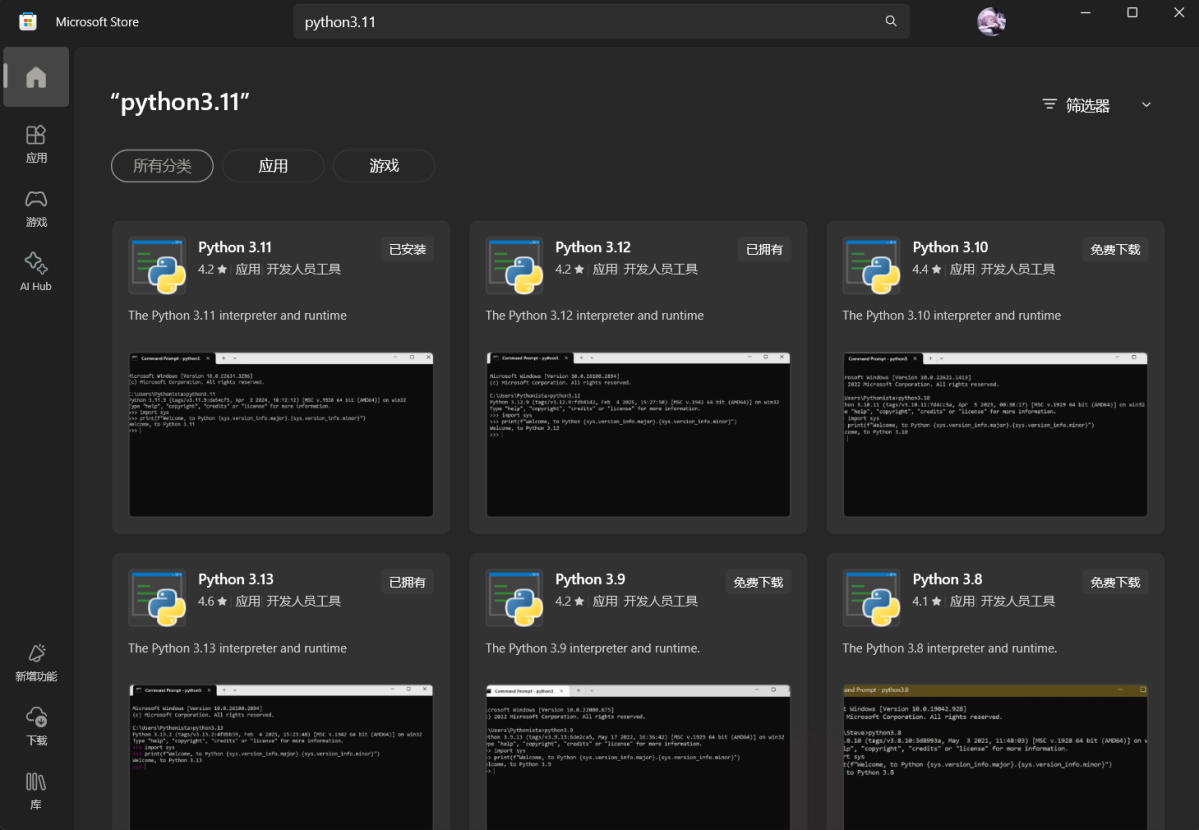 首先,我们需要在电脑部署Python环境,Python版本需要在3.8以上,3.12以下。这一步我们可以直接去微软应用商店搜索“Python3.11”,然后下载安装就行了。
