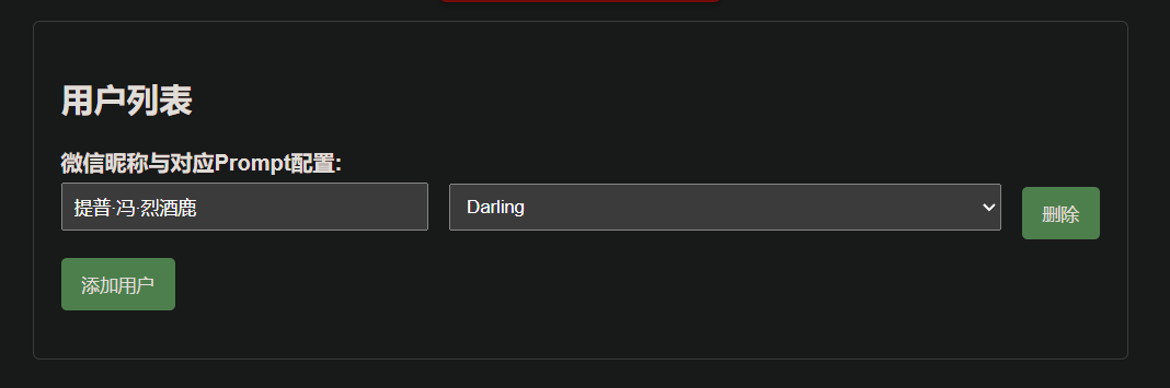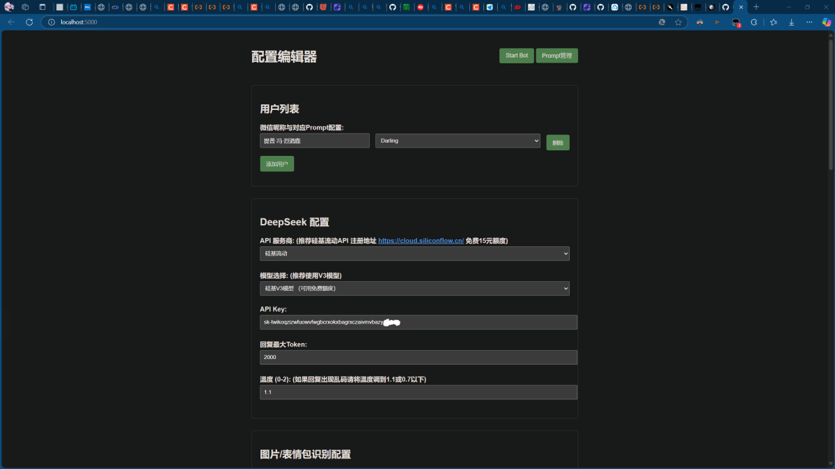 在完成上述所有操作之后,在电脑上登录微信小号,用户列表中填写微信大号,之后选择合适的人设,点击Prompt管理边上的Start Bot就可以正式开始聊天了。