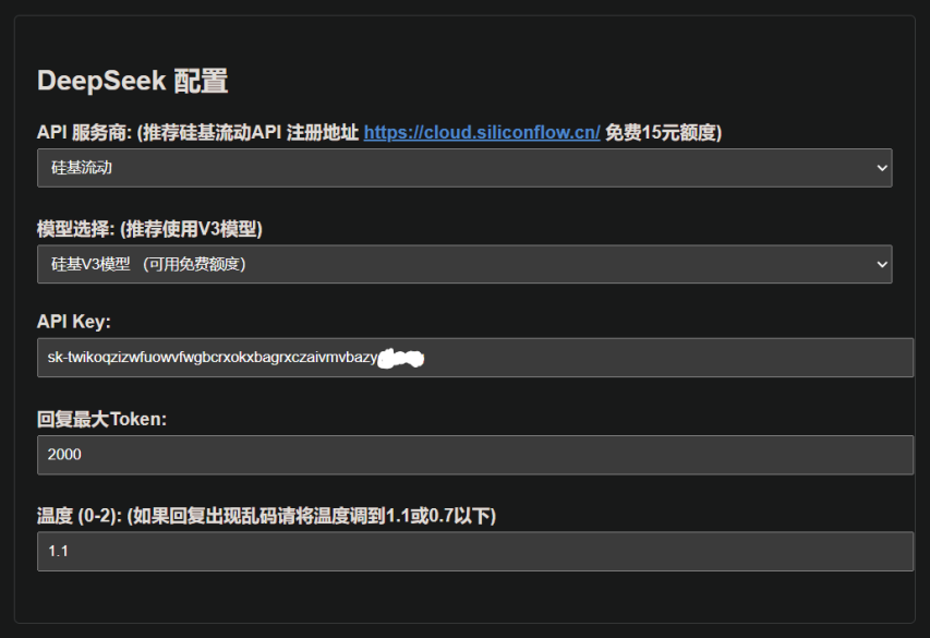 选择你的API服务商,这里选硅基就可以,然后选择合适的模型,将前面获得的密钥复制粘贴好。完成后就可以开始设定人设了